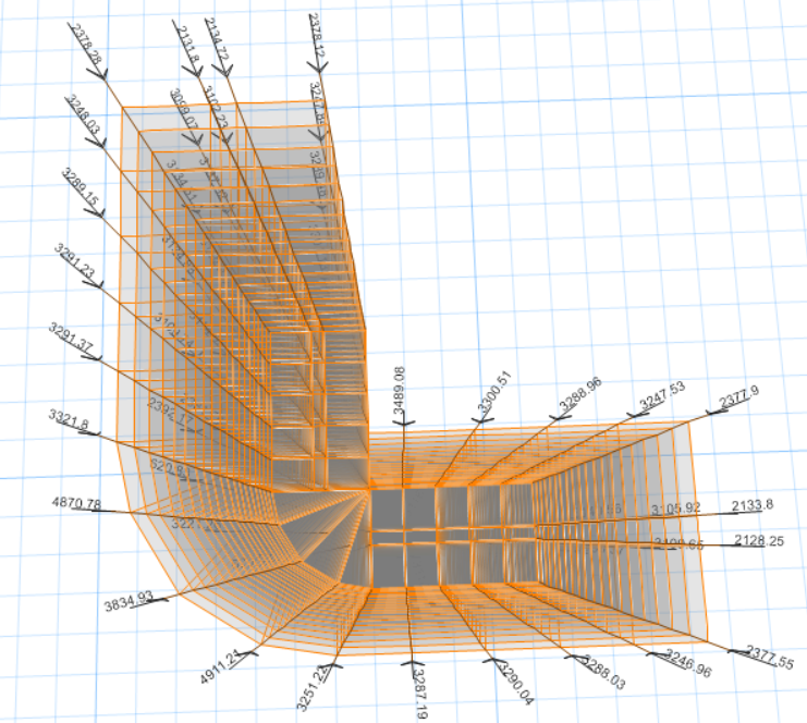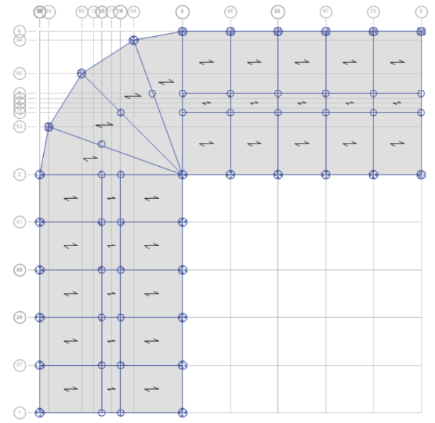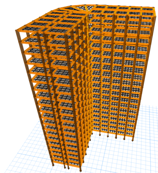 This building is a multi-storey building structure for office functions using a reinforced concrete structural system with a grid system of columns and beams. The building is L-shaped and there is a corner section with a triangular plate configuration. The building is designed to withstand vertical loads and lateral loads.