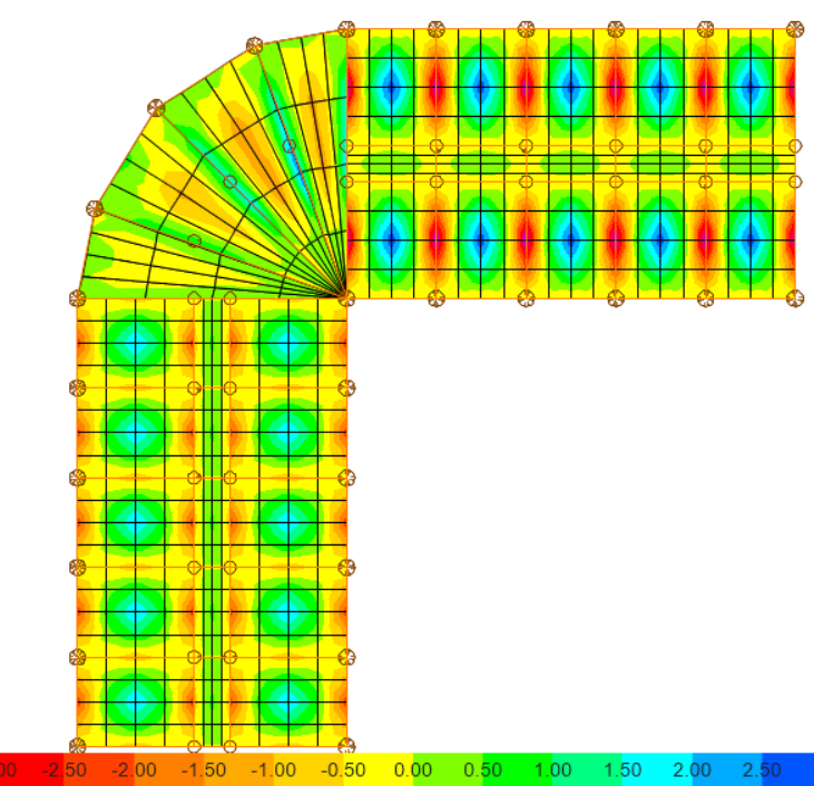 Shell moment is the internal force that occurs in the plate and wall (shell) structural elements caused by a combination of external loads. bending moment M11 is the force that occurs in the direction of the local axis 1 of the frame. It can be seen that the bending moments are marked with different colors. starting from purple which represents the largest negative moment and dark blue which represents the largest positive moment.